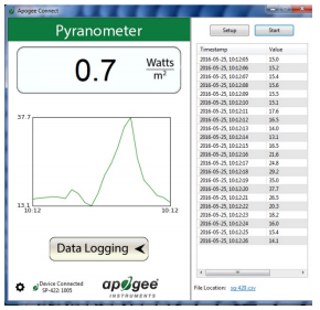 SP-420還內(nèi)置數(shù)據(jù)存儲芯片,無需其他記錄儀或計算機,即可自動記錄10000個測量數(shù)據(jù),方便了您的使用。傳感器電纜標配USB 2.0接口,可以方便地連接各種類型的電腦。通過配備的Apogee軟件即可輕松對測量數(shù)據(jù)進行實時顯示數(shù)據(jù)圖形。它還創(chuàng)新性地采用了5V DC USB供電方式,使其工作方式異常多樣性,您不僅可以將其直接插到計算機的USB接口上,還可以通過普通的USB電源適配器來直接使用220V交流電,您甚至可以使用移動設(shè)備常用的移動電源(充電寶)為其提供工作電力。